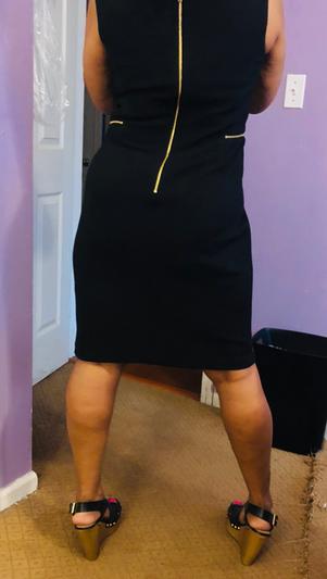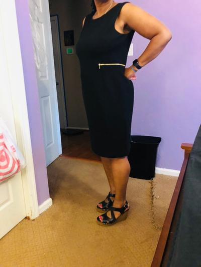If you’re looking for a simple and classic sheath dress, then this dress should be in the running. While I personally was not a fan of the gold hardware, that’s clearly a personal preference. I did find the dress to run a bit large - the only size available was a 14 (I’m normally a 12), and it was definitely more like 2 sizes to big, so I’d consider going down a size from your normal one. Aside from sizing issues and the color of the hardware, the dress is made very well - it’s even lined, which is always a plus. However, due to the lining and the thicker material of the dress, I would not recommend it for summer wearing. Overall a nice dress.