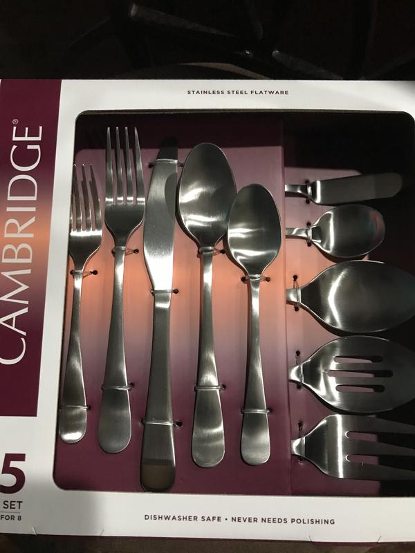DO NOT BUY. Serrated edges of knives are rusty, after only using a month. Impossible to clean. I put them away and dug out my old knives from a previous set. I am presently writing to Macys and Cambridge. Shocked by this poor quality and so far lack of response from either.
