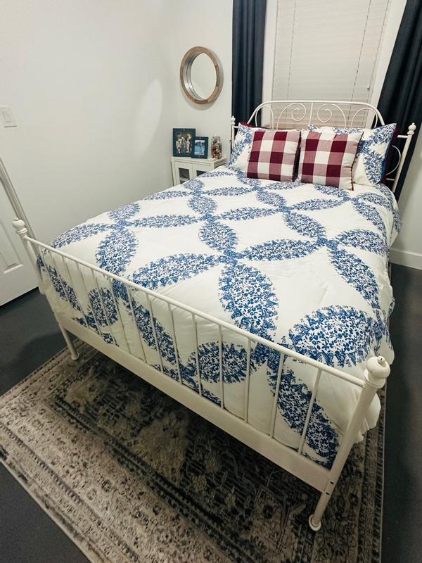 Absolutely love the color soft comfy fits bed perfectly queen it’s full to queen size with two shams. One comforter absolutely gorgeous. can’t wait to put it on my bed for my spring cleaning. It will look fabulous in my bedroom. I have cherry furniture and wood floor and this will look great in it the blue with the off-white.