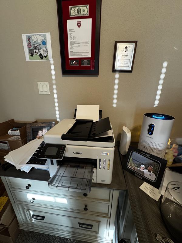 I definitely recommend this printer for personal use, home office, and small offices. The print and scan quality is amazing. I love how you can use the app on the phone and download the app on the computer as well, and you can do anything with it. The printer has two printer trays and a rear tray. The printer comes with the ink bottles and a fax cable. I was unable to receive the photo paper as the gift due to Canon not having any in stock, so I have no review for that. The printer, in general, is of good quality and is medium-sized. It isn't too loud at all, if you print a lot in color mode, probably the ink won't last you 2 years, hahah. But if you print basic things, it might last you 2 years, as the manufacturer claims. The printing is fast, but not super fast like having a Laser printer. Overall, I recommend this printer since Canon has very good tutorial videos if your printer isn't working, and also when you first set up your printer.