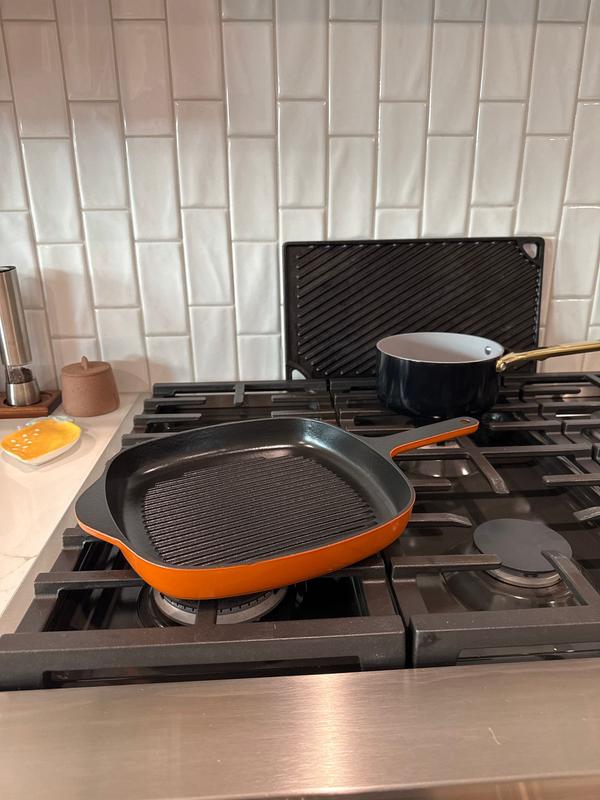 Love the look and feel of this cast iron grill pan though it is definitely more orange than the website picture. I have yet to use it but needed to get the warranty activated. I’m sure it’ll be wonderful and loads better than the cheap aluminum one I have been using.