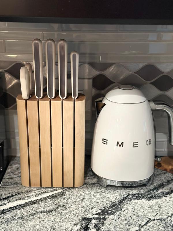 Rather lovely set of knifes. I like the weight of them. I didn't like that they didn't come with a block but I added them to a magnet on my fridge. I have had them only a few days and overall am satisfied with them they're sharp and pretty color. My photo is missing one knife as i was using it for my meal. love caraway products!