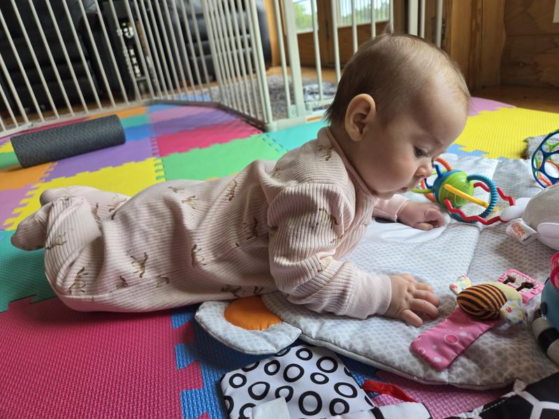 Normally I dont care for ribbed materials but I really like this one. I prefer thinner materials for my baby to sleep in so she doesn't get too hot in her sleep sack and this one is perfect. I also love the print. I love that its horses and not unicorns! It does seem to run a tiny bit bigger than some other sleep and plays. My baby just turned 8 months and can still just fit in the 6m size but she normally wears 9 month, which is fine with me since she can get more use out of it! Pictures are of her wearing it at 4-5 months