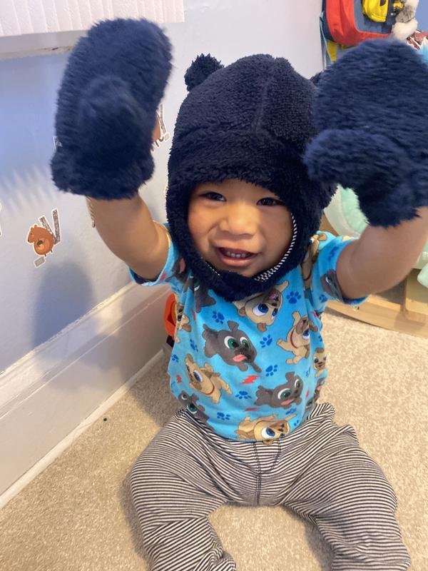 I bought the hat and gloves to match the navy blue Sherpa that is also sold by Carter’s. Perfect matching set & keeps baby warm on our walks!