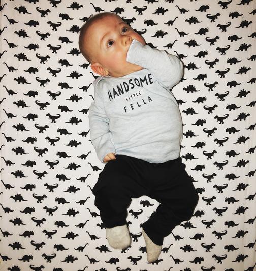 I couldn’t resist buying this set for my son in a 12-month size even though he is only 3 months now: his “coming home” outfit was the blue/gray version of the teddy bear onesie, so when I saw a white/blue version I had to grab it. The onesie, shirt and pants are all so soft and not too heavy, so they will be perfect for the spring weather in TN, where the nights and mornings are still pretty cool.