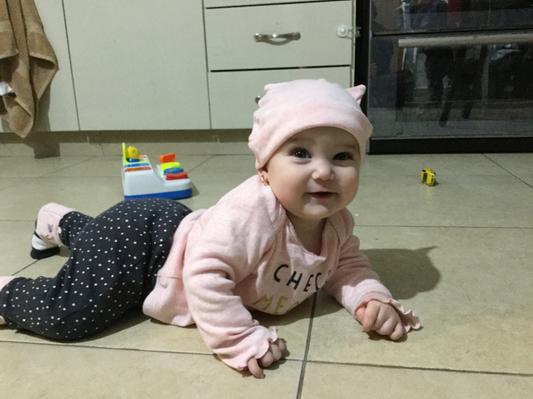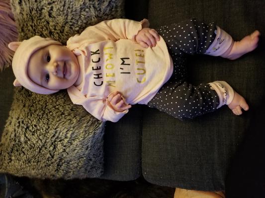 Well I can't say it's comfy for sure since I'm not the baby, but she looked pretty dang happy and cute! The whole ensemble is so nice in person and soft cotton with stretch. Love the dark Grey, too.