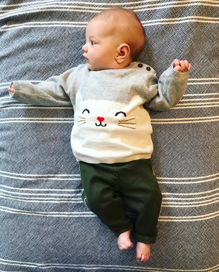 This is the perfect little light sweater. My LO is four months old and is a little on the small size so a three month old size fit perfectly. I love the design!