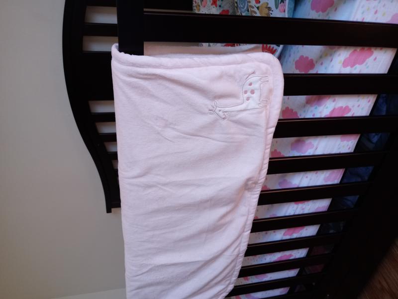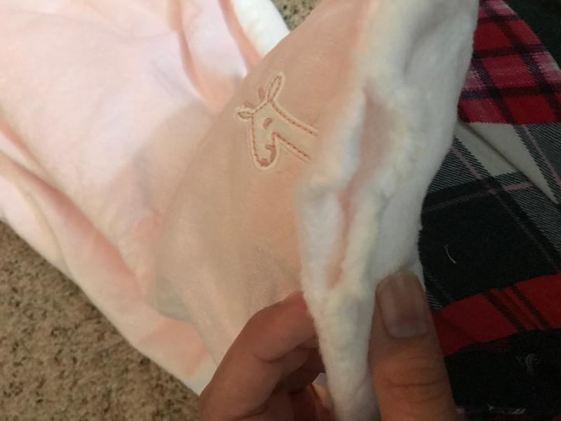 This baby blanket was exactly what I was looking for to snuggle my newborn in. It’s super soft like a throw blanket and very warm for the fall and winter season. The blanket is pink on the side with the embroidered giraffe and white on the other side. It’s also very large so I can see my baby using it for a long time.