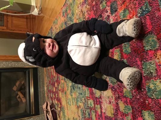 Our 6 month old looked so cute in this on Halloween. The jacket zips so it was easy to get on and off her when putting her in and taking her out of her carseat. Plus it is made of fleece so it did a nice job of keeping her warm throughout the chilly evening.