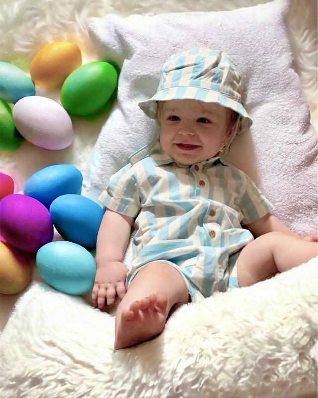 I bought this outfit for my son's first Easter. Unfortunately, the material was very stiff and had very little wiggle room. It was a pain to take on and off. I was also a little disappointed that the hat was too small on my son's head he doesn't have a large head). I ended up not using the hat which I feel was a big part of what made the outfit adorable.
