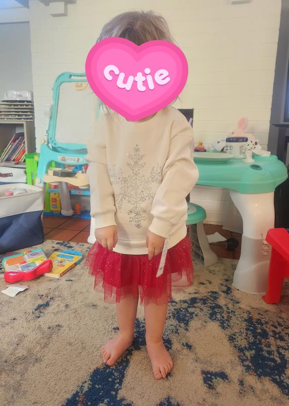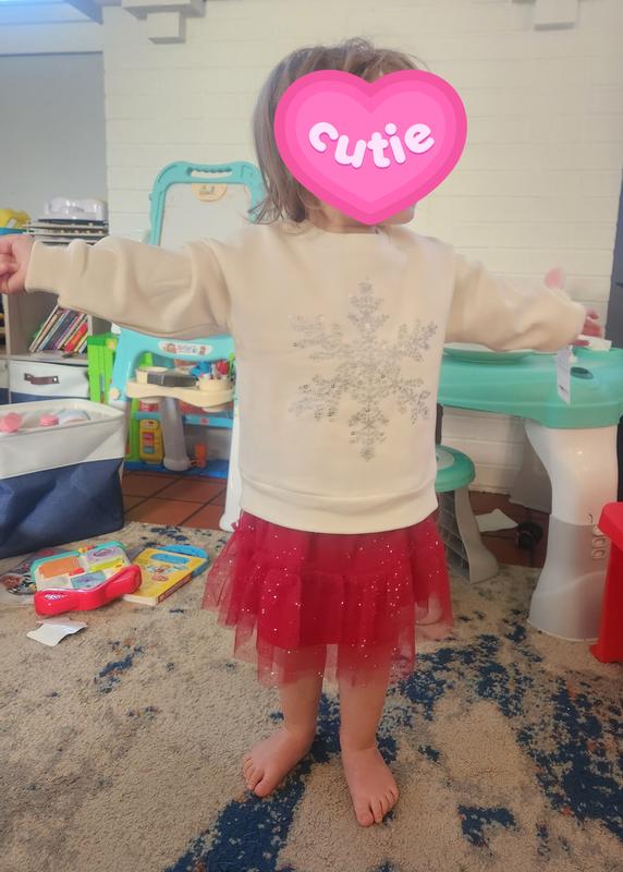 Adorably cute for grandbaby. She's 34in tall so I got 2T. The top is more off-white than white and the skirt is full of sparkles with shorts attached underneath. I got it for Christmas so can't comment on size yet but the top material is soft with a sparkly star. I waited till it came on sale to snatch it up