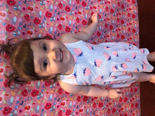 My daughter loves strawberries, and so enjoys this print. Perfect for the summer, dressy yet comfy to play all day. Coudn't say true to size, as my daughter is very tall, and needed 2 sizes up, due to it's length.