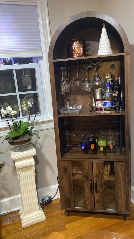 Farmhouse Elegance and Safe Design: This 71-inch arched bar cabinet in natural brown exudes rustic warmth and charm. Anti-tip hardware ensures stability, blending style and family safety.