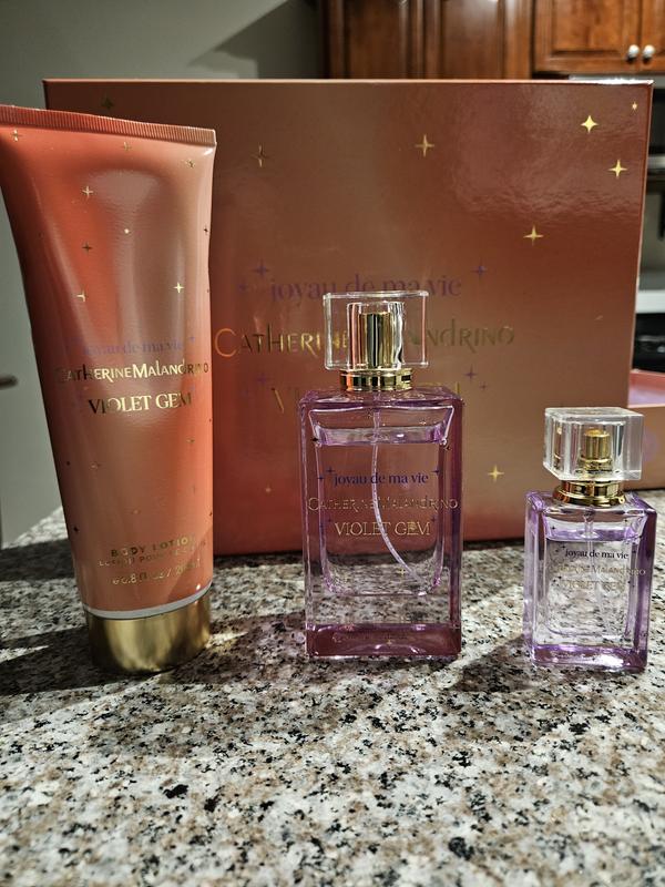 This gift set is a true “gem” ( pun intended ) :) … The packaging on the gift box is very beautiful and makes a great presentation for gifting. Within the box, there are two perfumes, one regular size one travel size as well as a body lotion. I especially loved the fragrance as it was pretty and not overly heavy - it’s a very intriguing scent you almost can’t put your finger on it but it’s fruity without being too sweet - I received a few compliments when wearing it. The body lotion is nice too. It’s very moisturizing and the scent isn’t too overpowering. This is my first time using this product line and I was very pleased.