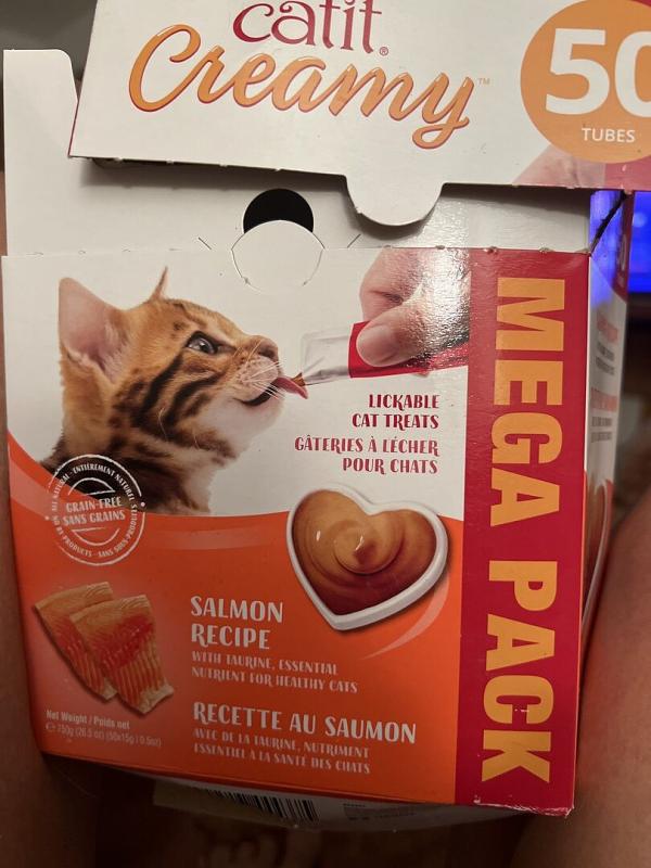 I bought my 3 cats their “third” 50 tubes box of “catit creamy” SALMON RECIPE because they loved the 1st & 2nd boxes. Unfortunately, the third box of Salmon Recipe tubes were watery and diluted of taste!!! My cats were disinterested and they won’t eat them. So I will no longer pay ALL that MONEY for a box of treats my cats won’t eat.