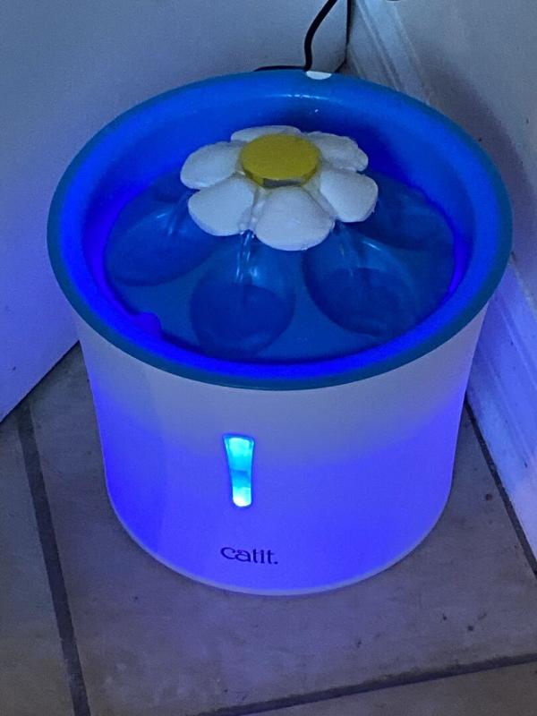 I have been using an older version of this fountain for several years. The cats and dog all adapted quickly to the new flower. The only negative is the length of the USB wire; it is about two or three inches too short. The fountain is in the bathroom where the outlets are all at sink level. I have a USB "extension" plug in that adds the length needed.