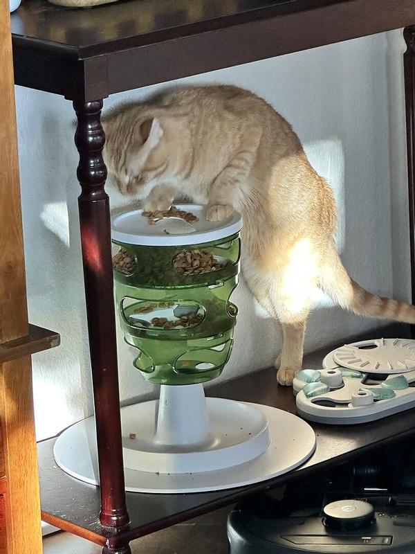 Ignore the negative reviews, I've bought this like 4 times. I'd say there's a 90% chance your cat will like it. If they don't then change the dry food, add treats in the dry food, or lower their food intake through your other methods. It's wonderful and keeps most cats busy for long periods of time. It's fun like those gambling coin games lol. Keep your furry children engaged and not-bored!!!