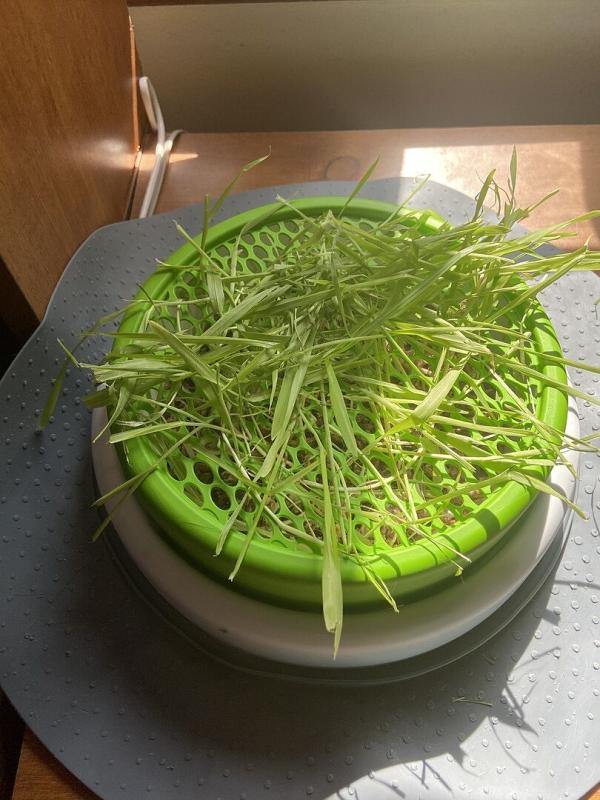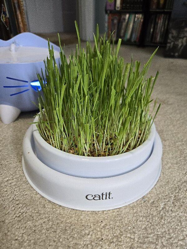My cats are very curious about what is growing in this bowl, but it is taking a bit of time to grow out like the picture shows, also they did not note how much light this grass needs, so I provided a grow light above the bowl to help the grass grow.