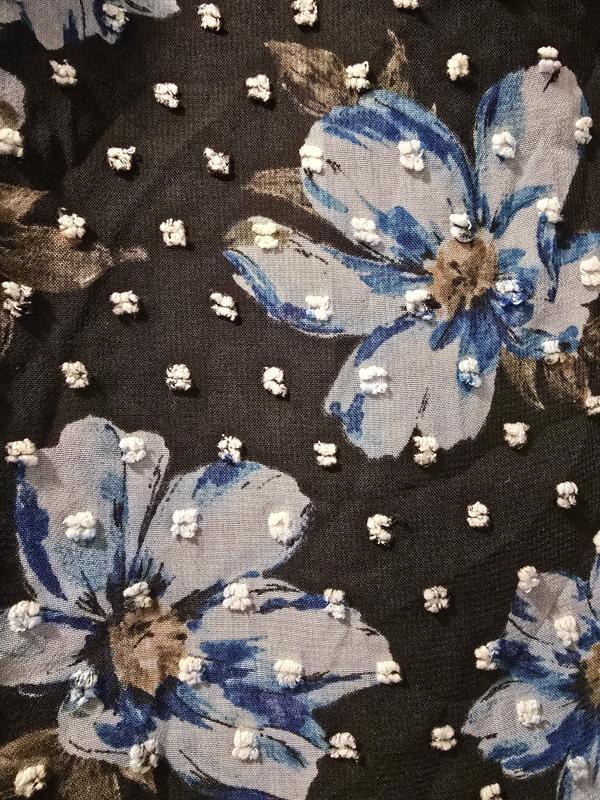 The blue flowers in this top did not pop like they did in the photo. It is still a very nice and unique top. It does not have any spandex however.