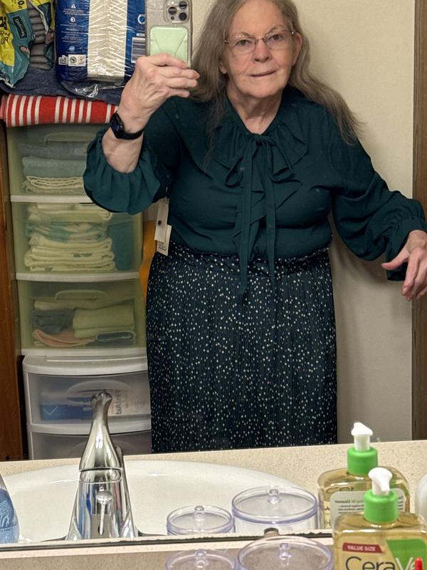 The blouse looked cute. I’m returning it because of the sleeves. They’re too long as I don’t like my hands being covered. This would’ve been okay if the wrist elastic had been slightly snug to hold them in place. But the elastic wrists were large enough to go around my wrists more than1-1/2 times!