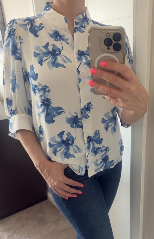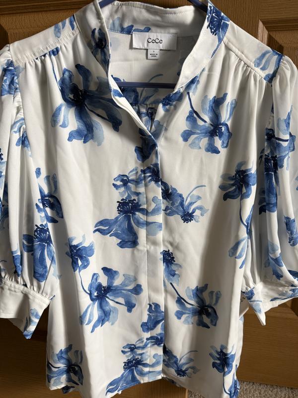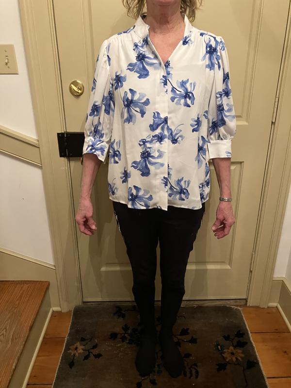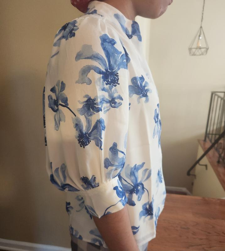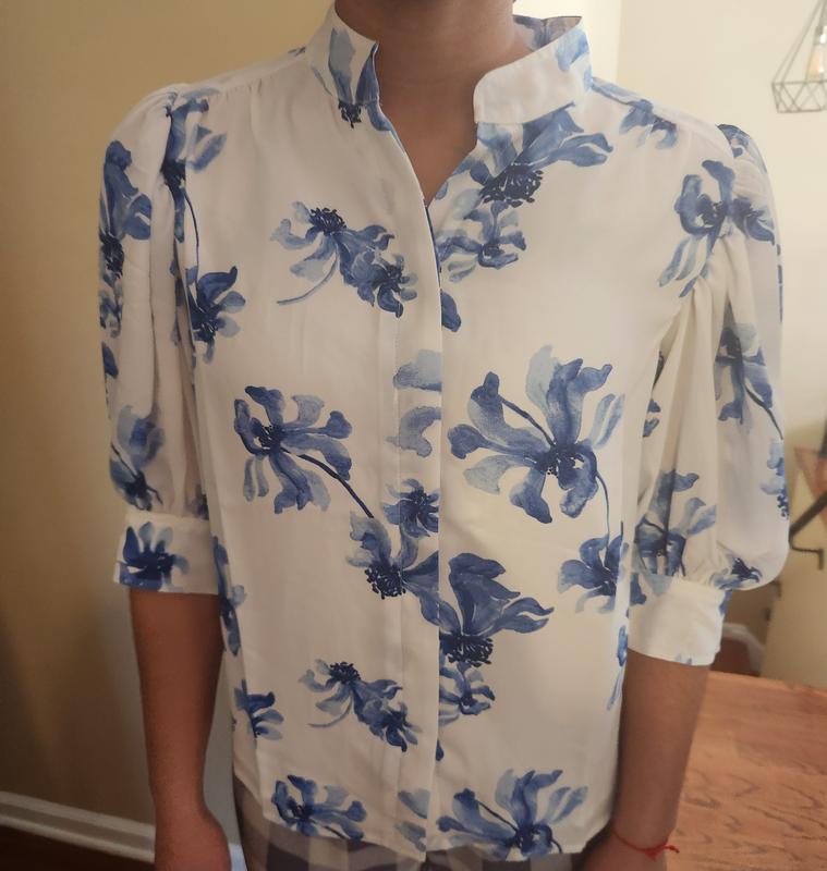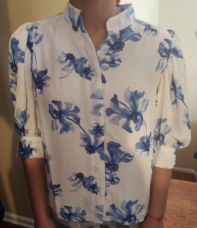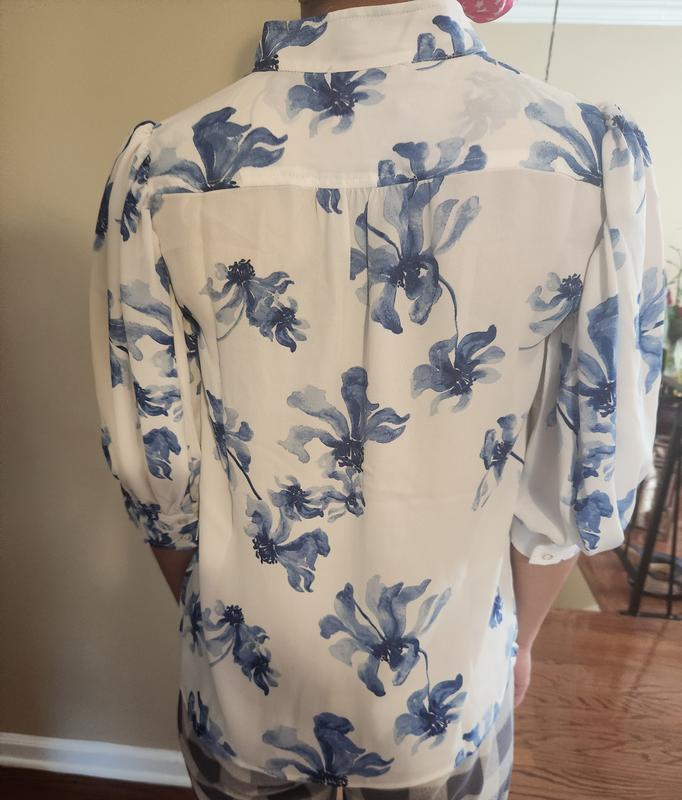 This shirt fits and looks amazing. Good quality and easy to wash. The puffy sleeves add a nice elegant touch. The collar adds to classic, conservative and classy style. The pattern is not too busy. Perfect for dress up at the office with white or black pants or dress down for the weekend when paired with jeans or shorts. It is true to size, perfect comfortable fit. Great for spring / summer.