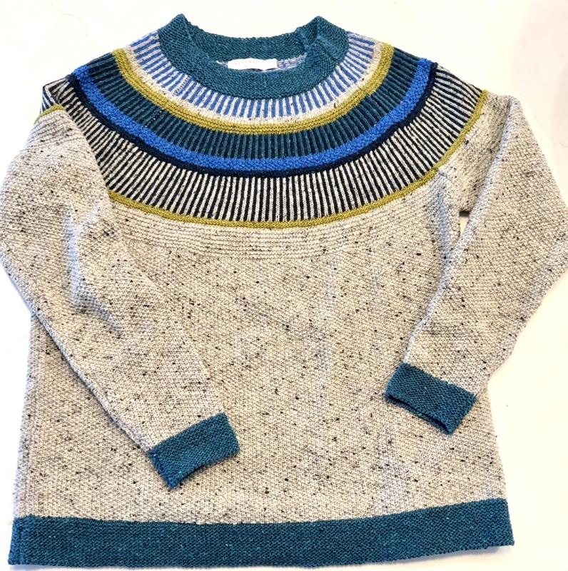 This a beautiful lightweight sweater, well made, lovely knit pattern, a tiny bit oversized, and has gorgeous colors ( I purchased the Oatmeal flecked / Icelandic color which is a typical Donegal heather look and bright turquoise, green blues) I would not hesitate to purchase another item from this company! I bought a size medium I am 138 lbs, 5' 6" and it fits a bit oversized on me with no shirt underneath. Hope this helps someone.