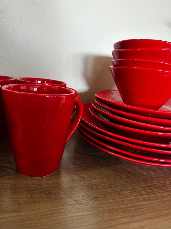 So this berry red 16piece dinnerware set is beautiful each pice is made with good quality. There nice and thick. They clean very easy Not only can you use them at Christmas time. But I will use them for every day ware too. Very nice the. The plates are perfect size for any dinner two sizes to choose from. The coffee cups are pretty good size too not to small I like that.