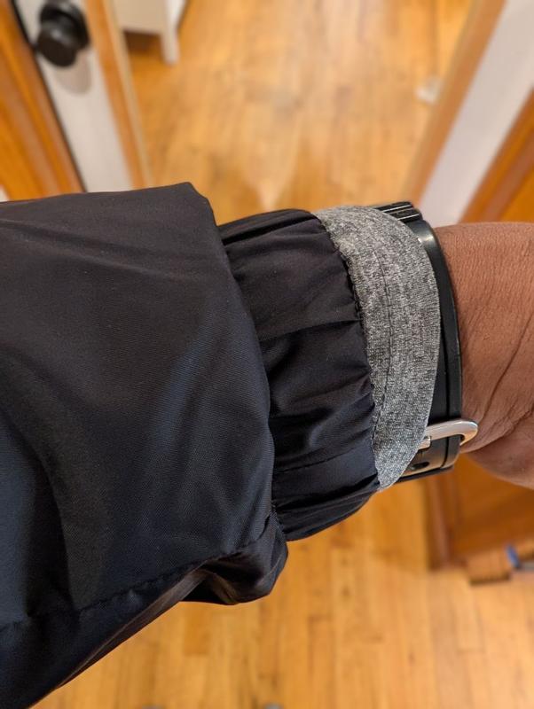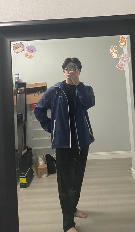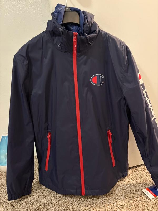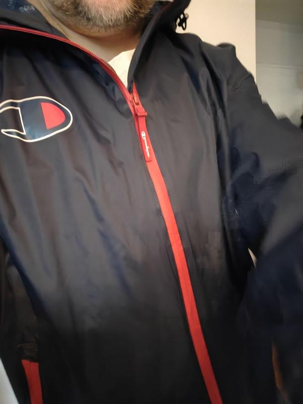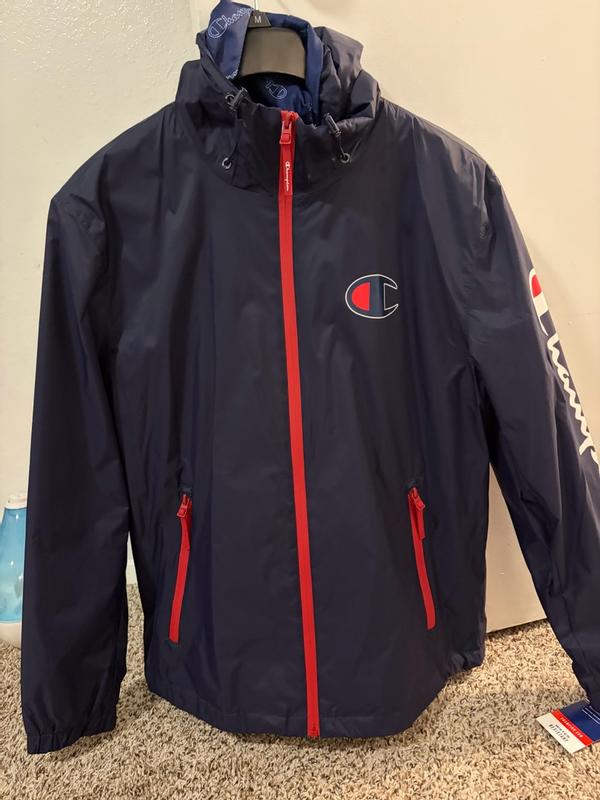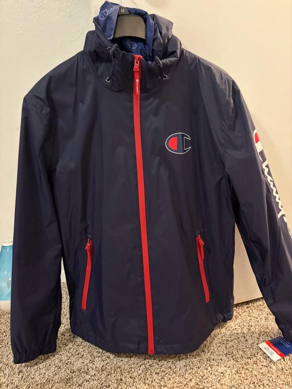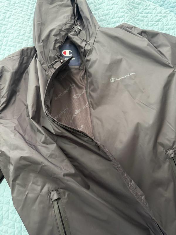 Stack it is pretty good in some ways and not so great in others. Let's start with the bad. I'm about 6'1 and more of an athletic build. I have a extra large jacket. There is one problem when it comes to fit and that's the sleeve length. You can see in a couple pictures that my shirt I'm wearing underneath. The jacket is peeking out from the sleeves because the sleeves are just too short. Another thing I'm not a fan of, and to be fair is common, is that the mesh lining that's in the body of the jacket doesn't go through the sleeves. The lining through the sleeves is a solid material. I'm a sweater, so in terms of comfort to always nice to have a mesh line in versus a solid one because the solid linings tend to trap moisture and it just sticks to your skin. Bottom line, I wish it had a mesh lining throughout the sleeves. The shape of the jacket isn't the worst, but it is a little boxy and there's a little bit too much room in the arms. The jacket is also pretty noisy, lots of swishing noises. Now for the good. And when I took this jacket out of the package I thought it was not going to keep me safe from any rain, but I actually took it on some errands through a pretty decent rain and I didn't get wet. Could I stand out in the rain for an hour, probably not, but running in and out of stores, it works just fine. Like other champion products I've tried recently, the quality is pretty good. Zippers, stitching, cinchers, they are all pretty quality. Jacket is also pretty good in blocking the wind.