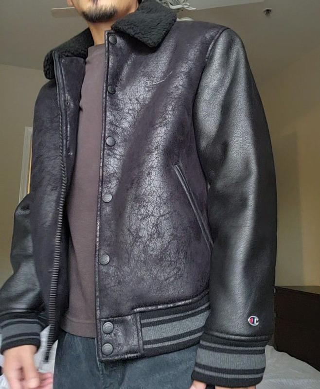 I love the look and feel of this varsity jacket! It’s made of faux fabric and has a cool, vintage look! The collar and body are sherpa lined making it warm and cozy, and perfect for cold weather. The material feels durable and well made. The waist and cuffs are striped and made from stretchy fabric and a banded hemline, so the jacket conforms to my body nicely. It fits true to size. I’m 6”1 and 165 lbs, and a size large fits me perfectly. The Champion logos on the chest and sleeve are noticeable but blend well with the overall style. If you’re looking for a varsity jacket that is not only comfortable and warm, but has great style, I highly recommend trying this for yourself!