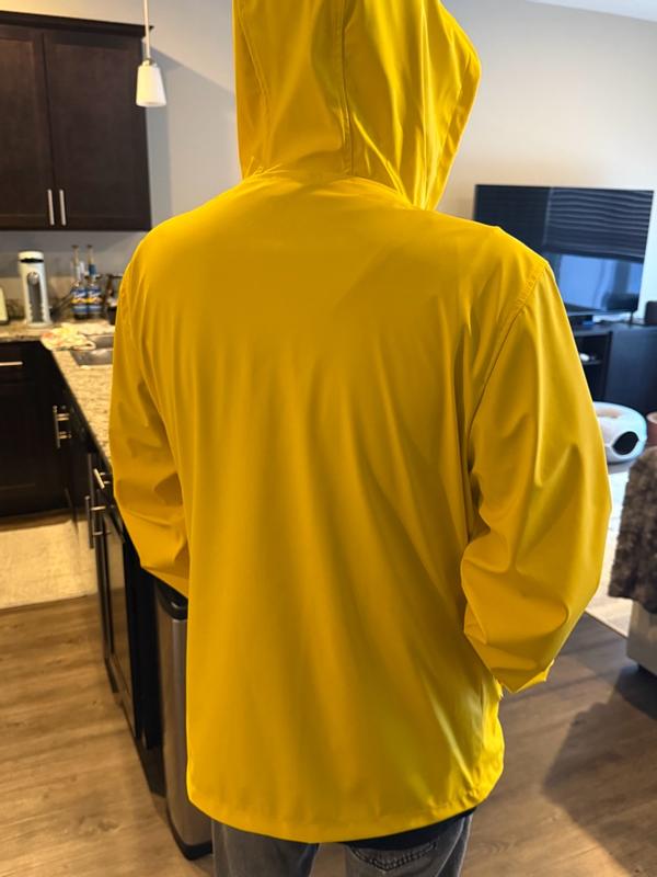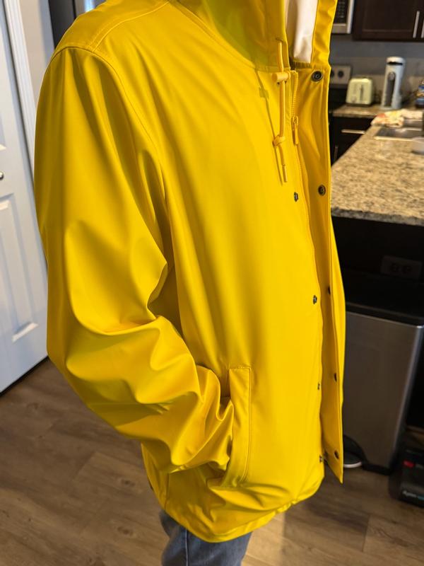 The perfect jacket for rainy weather. The rubbery material is great for moisture wicking, and it’s lightweight enough for travel. It’s also got two deep zipper pockets on the side which is a plus. The yellow color is absolutely amazing in person too! Pictures don’t do it justice for how bright it is!