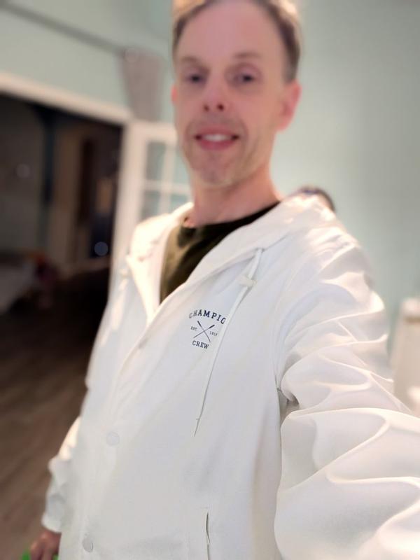 This rubberized hoodie from Champion’s Crew collection is alike the grown up, sophisticated version of the rain slicker you had as a kid. It is lined with a soft fabric, including in the zippered exterior pockets, but the exterior feels like an old school raincoat. Being rubber, it isn’t really breathable, but it does offer excellent protection from the rain. Weight wise, it’s pretty light. The zippers are heavy duty and high quality, and the added coach’s jacket style button closure on the front is a nice touch. Like most Champion gear, the embroidered “C” patch is at the wrist. The graphic on the jacket chest is kind of whatever, in my opinion, but I really dig the color and length of the jacket. An XL fit me well (6’q” and about 200 lbs.) Overall, a nice addition to my rain gear that I’m sure will get heavy use come spring. Good stuff.