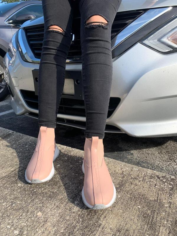 These sneakers are really cute and comfortable! They are definitely much nicer in person than the photos portray. It might be a good idea to go a half size bigger because they are a little narrow. They may seem very big and bulky when you put them on, but they aren’t as heavy as I would’ve expected. The color is a pretty neutral pinkish-tan. I was worried that my feet would be sweaty when I took them off but surprisingly they weren’t. I found the built-in sock material to be a bit itchy if it’s directly touching my skin so I only wear it with crew-length socks. The pull tabs are very helpful when getting these shoes on, and yet are very discreet and don’t look bad. I choose to wear these shoes daily now because I just love how it hugs my foot with the support it provides and yet still looks very sleek and elegant.
