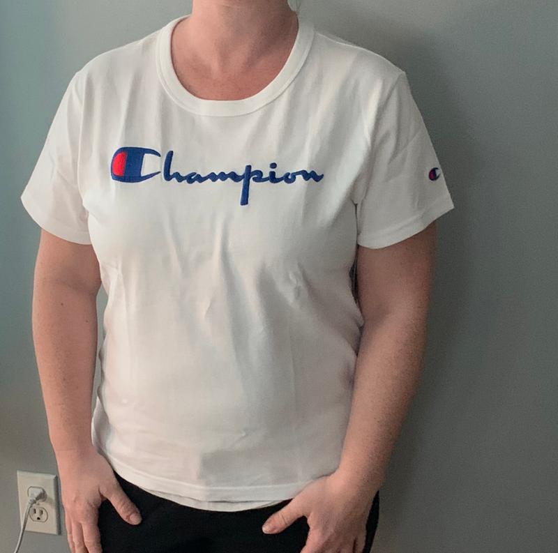 I like this shirt because it’s a high-quality, heavyweight cotton. It is a “girlfriend” shirt, so it is a slimmer fit. It also seems a to be a bit shorter than a regular length tee; not exactly a crop length top, but definitely not a regular length tee. The “Champion” logo is embroidered on the center chest, making the shirt feel and look even more premium. Overall I like the shirt but if I get another Champion girlfriend tee I will probably size up for a looser fit.