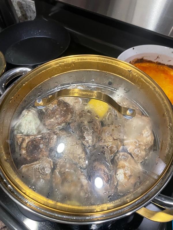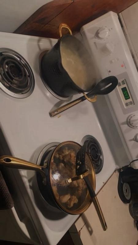 This cookware set is absolutely gorgeous. The gold handles really top it off ! It’s non stock and oven safe. I love that it comes with everything you need ! Perfect if you are just getting started or wanted to revamp your kitchen.