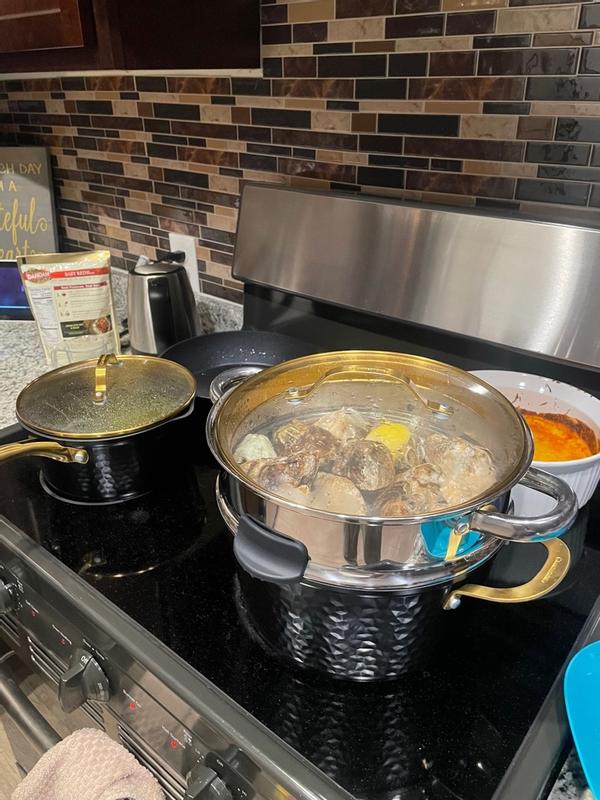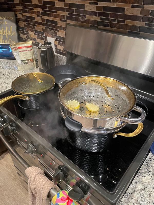 This set of Pots and Pans is absolutely fantastic! The design and color on these is gorgeous! I love how they thought of making the lids strainers for easier draining. It cooks food thoroughly and evenly and there was no sticking! Highly recommend this beautiful set!