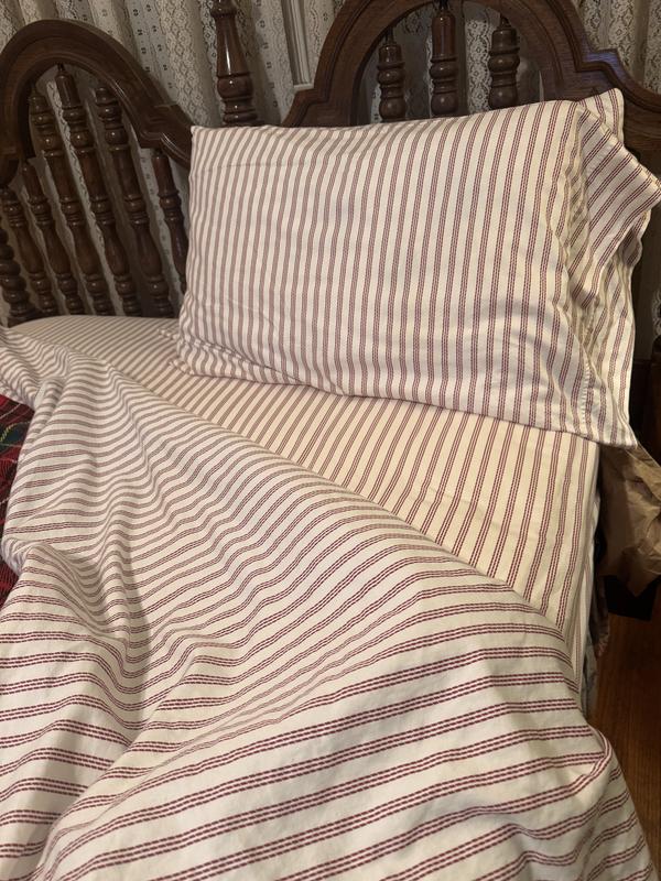 Handsome sheets with a luxury feel. I like the contrast of these red stripes folded over my predominantly yellow floral quilt. Very French.