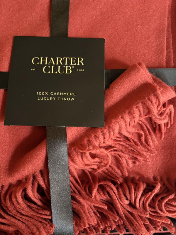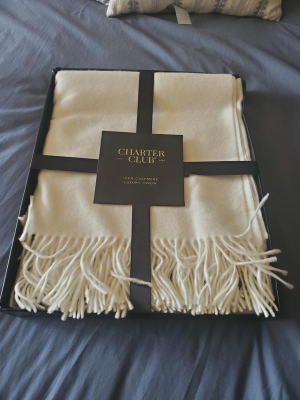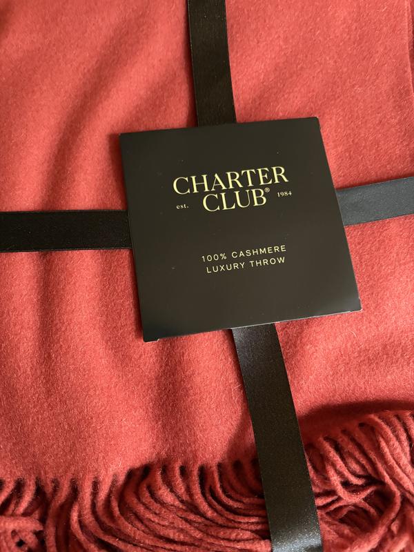 This 100% cashmere throw from Charter Club is pure luxury. The cashmere is silky soft and beautiful. It is a nice thick weight, amazing quality. The dimensions are 50" x 60" and it looks great over furniture and feels heavenly when it’s wrapped around you. Perfect gift for someone that has everything!