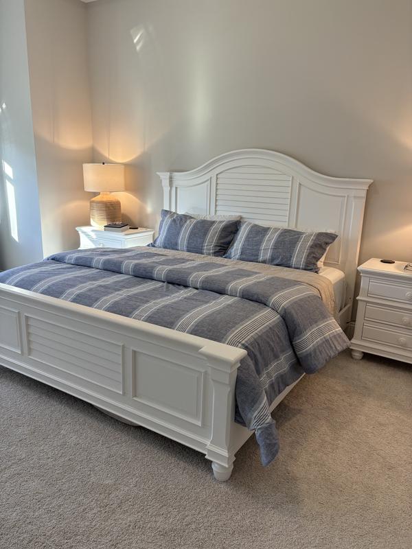Love this comforter. It’s so classy and really livens up my white bedroom set. It’s a true white with some light blue and mainly a chambray blue. Found other comforters that were not 100 percent cotton for basically the same prices. Hoping they hold onto this design in the future.