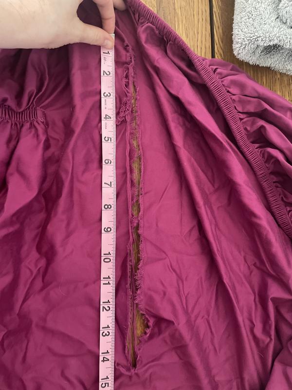 Great color, very well made, tailoring looks rich, decorative stitching along hemline of sheets and pillowcases. Feels good on skin. Fits my Queen-size14 inch deep mattress easily with room for even deeper size. Well- fitted, stays in place. launders nicely. Very Zhighly recommended. Submit as TELLIT