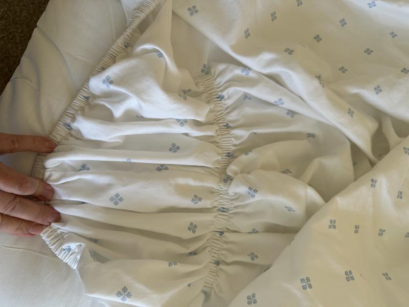 The fitted sheet had rounded elastic so that it fit the box spring better with no sagging. The sheets feel soft. The pattern shown matched the pattern received