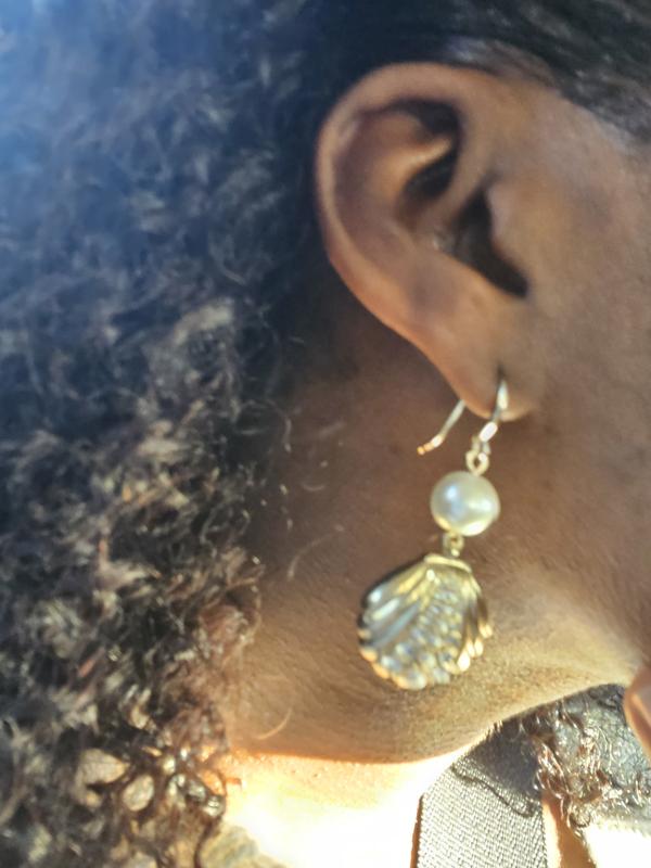 First, I saw the long necklace with a pretty gold shell pendant, then I found the earrings. I bought both, a full set. Shells are always great for dressy Spring and Summer events by the beach, pool, or resort.