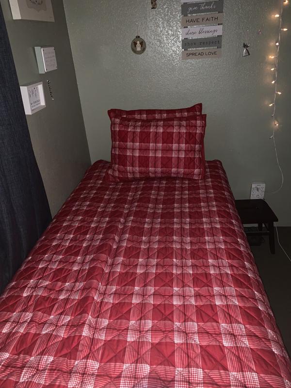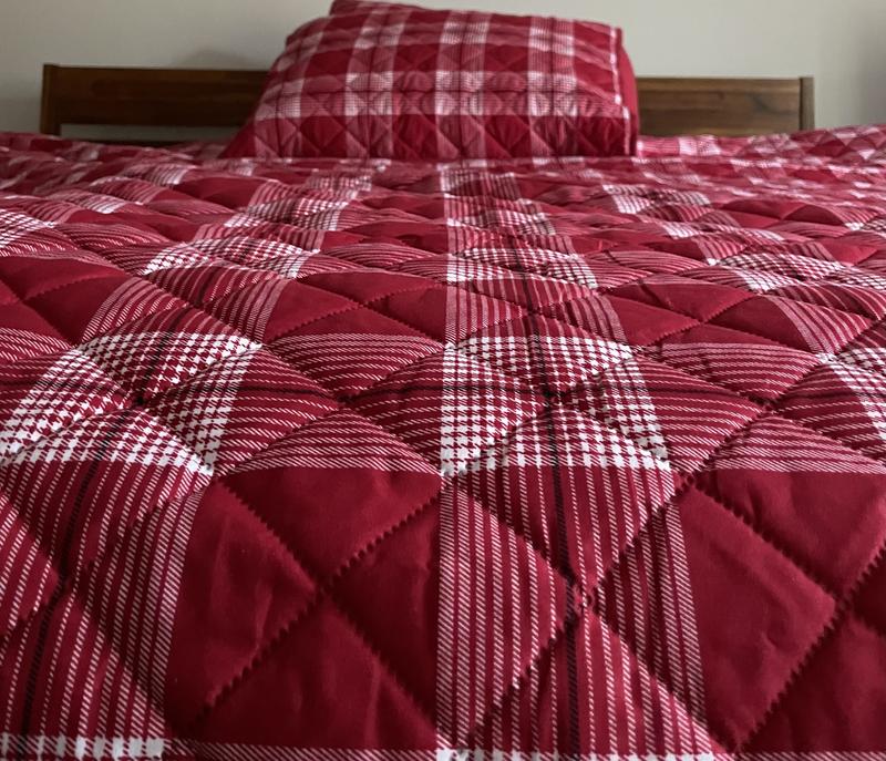 The quilt makes the whole room a cozy Christmas retreat. A plus is that it is reversible, so you’re getting two looks in one. So charming. Soft and good quality cotton. Love it for the winter season. It is a nice light weight quilt and it is very pretty and can be used year around, not just Christmas. I definitely recommend this quilt as a beautiful centerpiece in a bedroom.