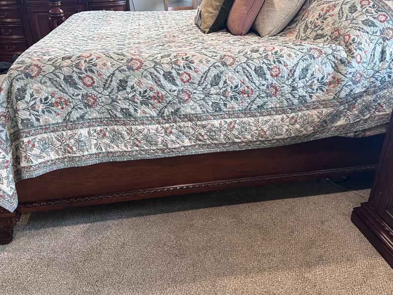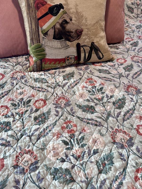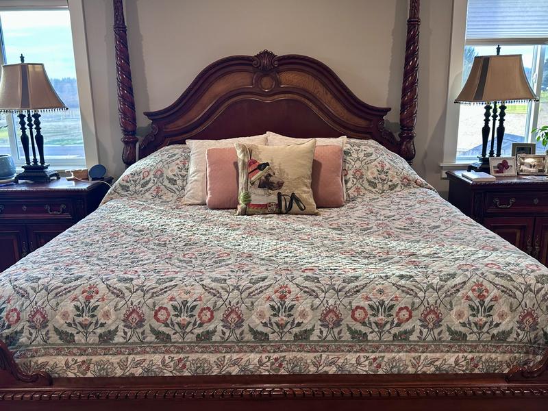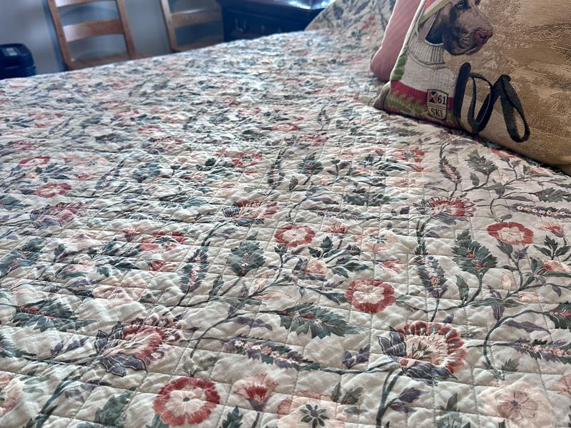 This king size quilt fits our bed very well with a 12” mattress and bed pillows stacked two high. It’s a thin quilt with softness and bend right out of the bag. Further washings will only make it softer. The colors are muted, but with enough saturation that it doesn’t look washed out. The quilting gives the illusion at first glance that the stitching follows the pattern in the fabric, but the quilting is actually a square grid on the diagonal. This gives the look of a more expensive quilt. I love the classic pattern with a contrasting border. The florals can transition through the seasons because of the shades of orange/rust and muted greens. It’s winter time in the north and our ski themed pillow does not seem out of place on the bed. I’ve been looking for a new quilt for quite awhile and am so happy with this purchase. Well worth the sale price.