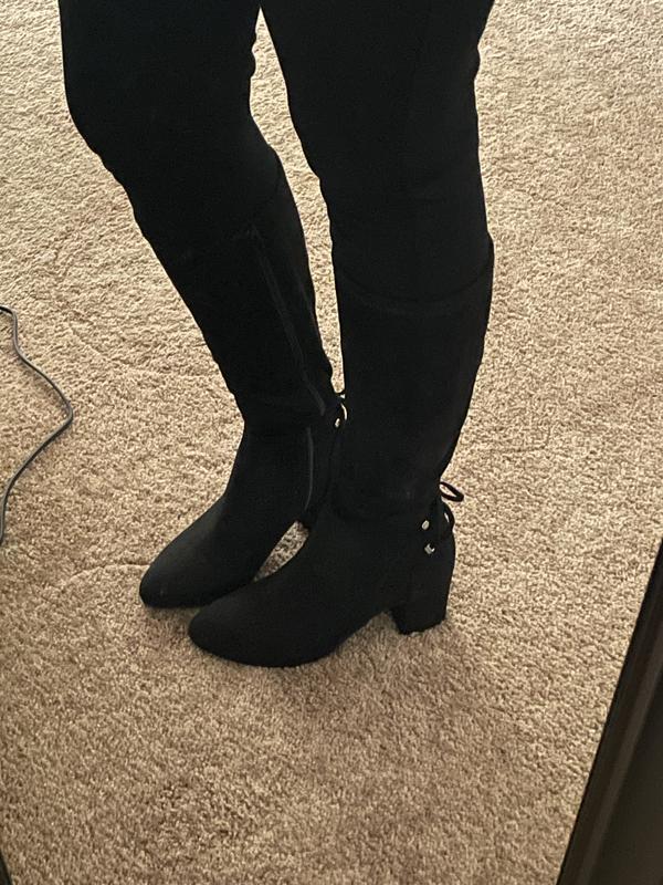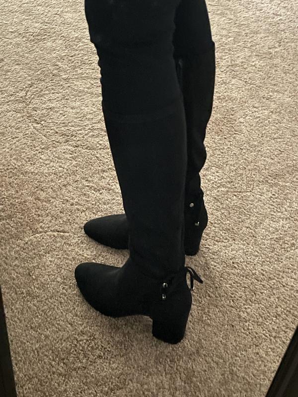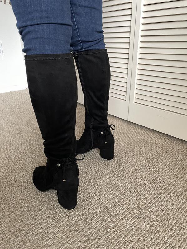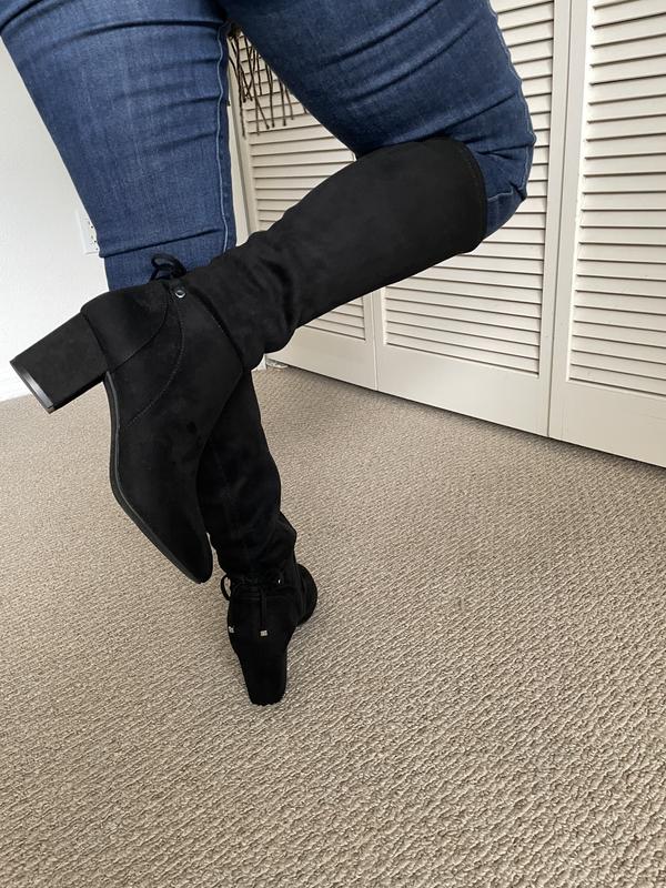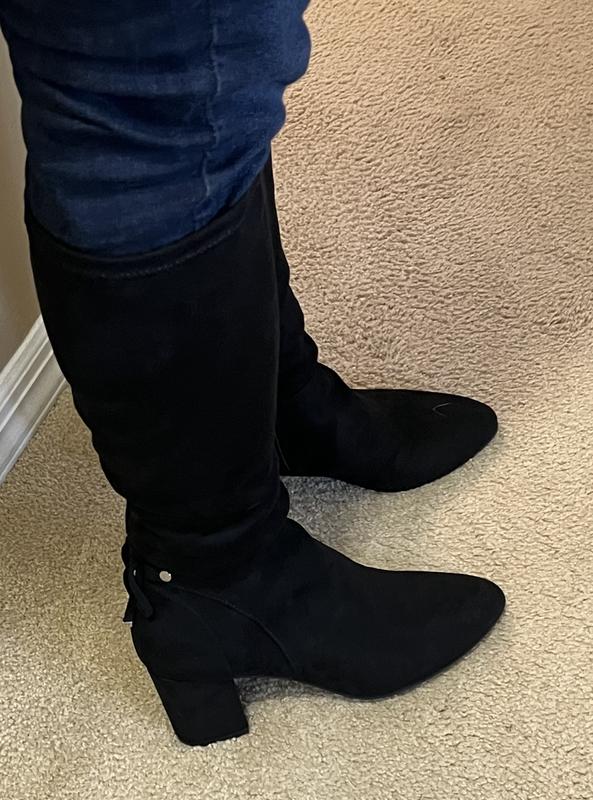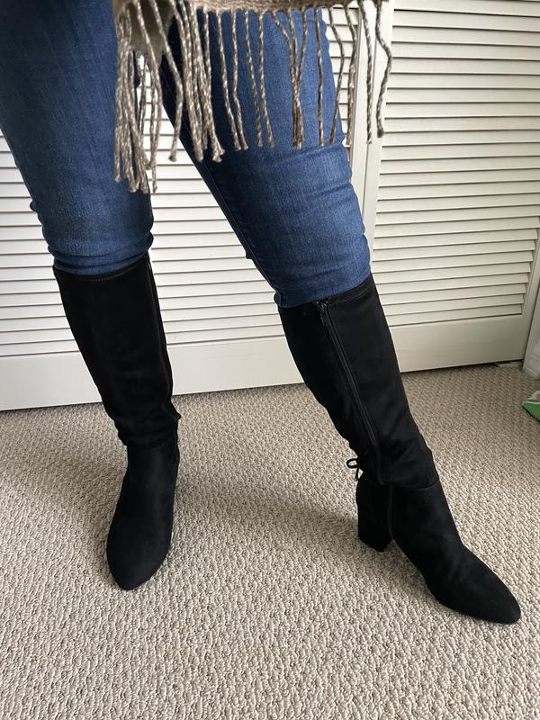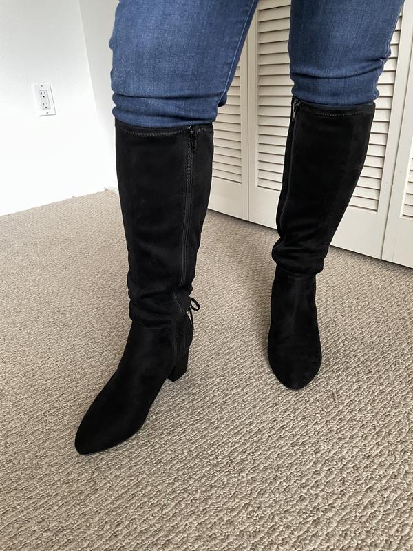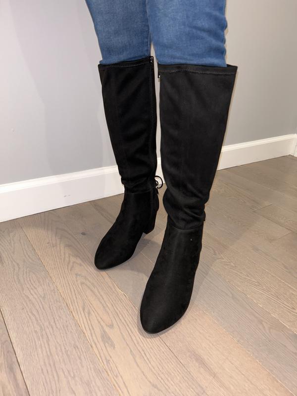 good price for boots-just not thrilled with the way the boot so stiff right at ankle where there's a seam-not noticeable in photos...Not so comfortable for walking. but look great & love the heel!