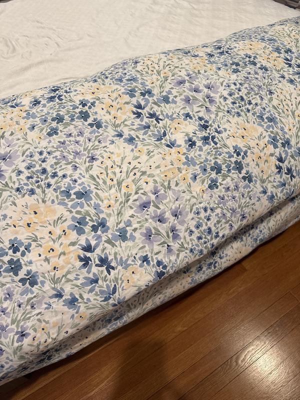 Bought it because it had the same dimensions as the Charter Club Prima HiLoft comforter that we bought (king size) and it said 100% cotton. Print is very nice - calming but beautiful with a bit of color, more on the pastel side. That said, it still feels a bit plasticky even after washing. If you like crisp cotton, this is for you. I’m hoping it will soften up with use.
