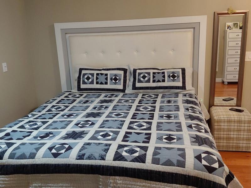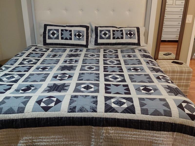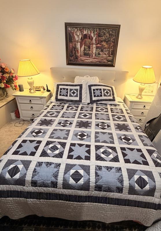 This is a very nice, high quality quilt set. It comes with two pillow shams. The blue, white and gray colors are vibrant and would blend in well with a bedroom color scheme in any of those colors. This set would look especially well in a bedroom that has a country theme. It is thick enough to keep you warm on chilly nights.
