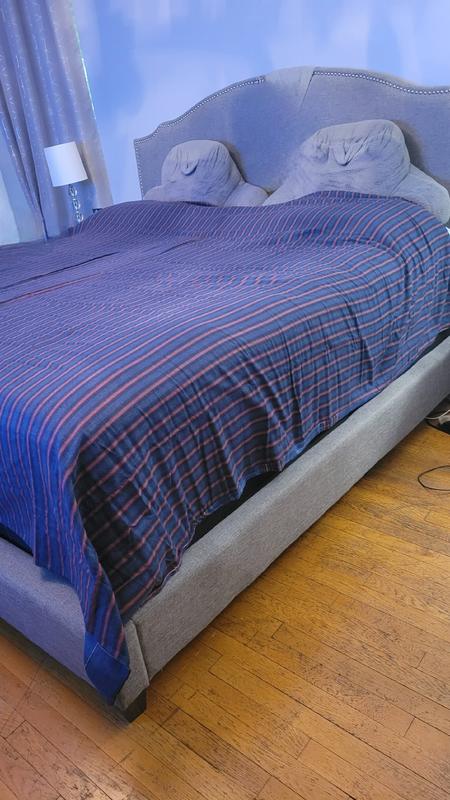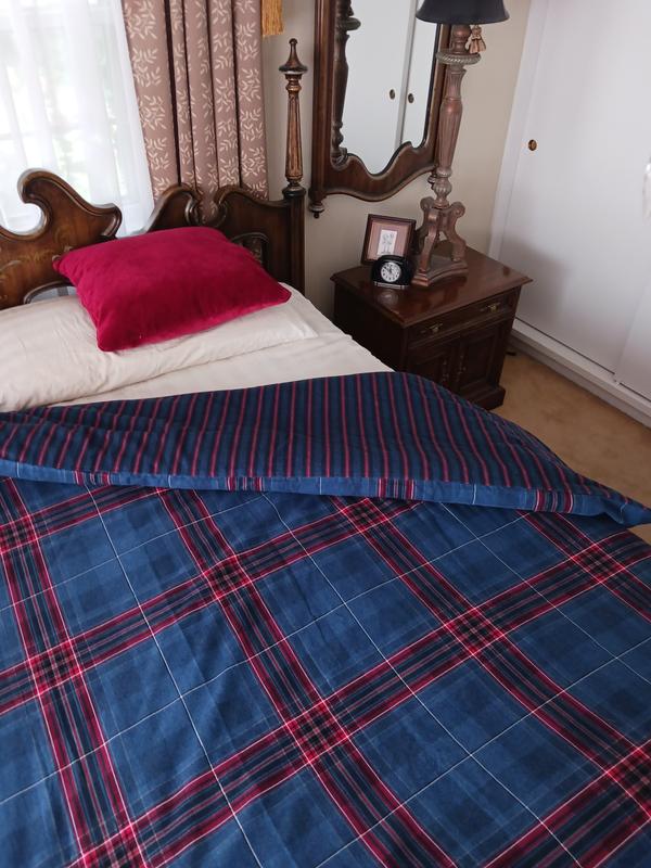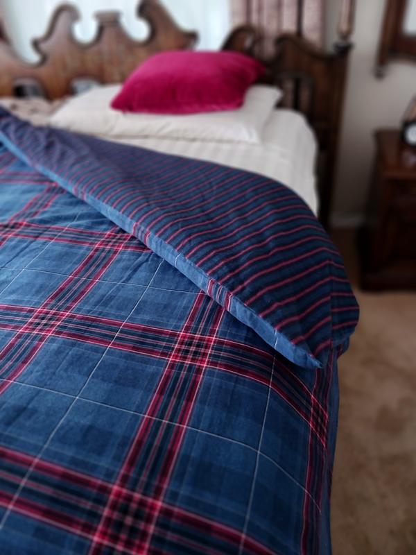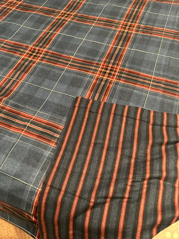 This plaid king size duvet cover is soft, warm and has a velvety feel. The material is 100% cotton, and feels very similar to Jersey knit. It’s a great transition to fall weather. The colors are vibrant, and it is reversible, plaid on one side, striped in the other. The picture and description is a bit deceiving, it seems like it would include pillow covers, but this is only for the duvet cover. It has hidden button closures that are easy to use. It also washes very well, I thought it would wrinkle but it came out of the dryer great.