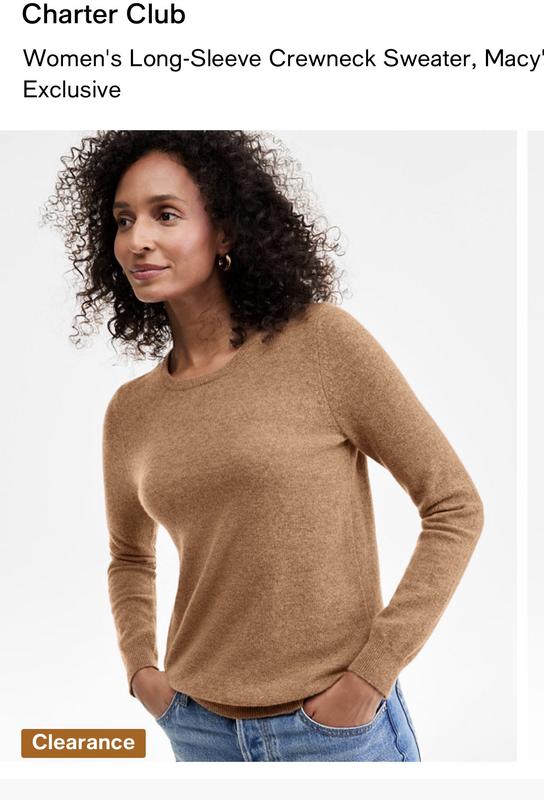 I purchased the Charter Club cashmere crewneck in solid praline and received the best price yet! I looked for months then I found this one. I’m so glad I waited and tge guy was what I wanted relaxed! The sweater is so soft and lovely!