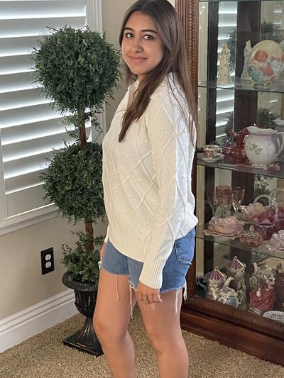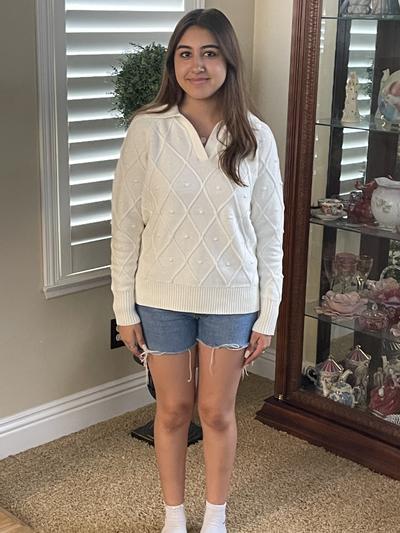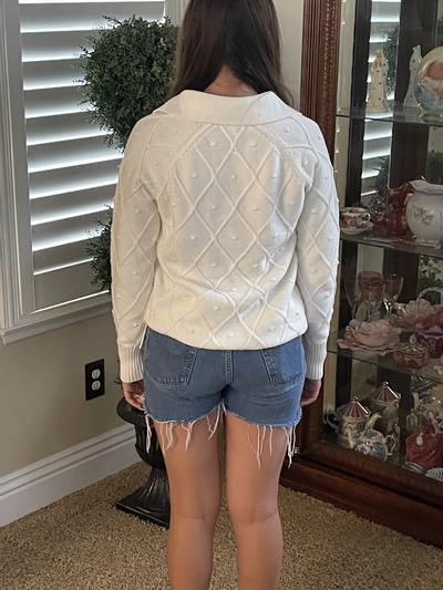 Really cute sweater and true to size. I am very pleased with my purchase and recommend. It is a tad heavy per the other reviews but I don’t feel that’s a negative.