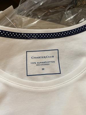 Just love Charter Club tops! Material is the perfect weight, never see through, and even after washing it stays perfect. I’m 5’5” 145 and the M is perfect. Only thing I don’t like is the blue material around the back of the neck no matter what the top color is. Only really shows a little on the whites but hopefully they’ll change that soon!!!